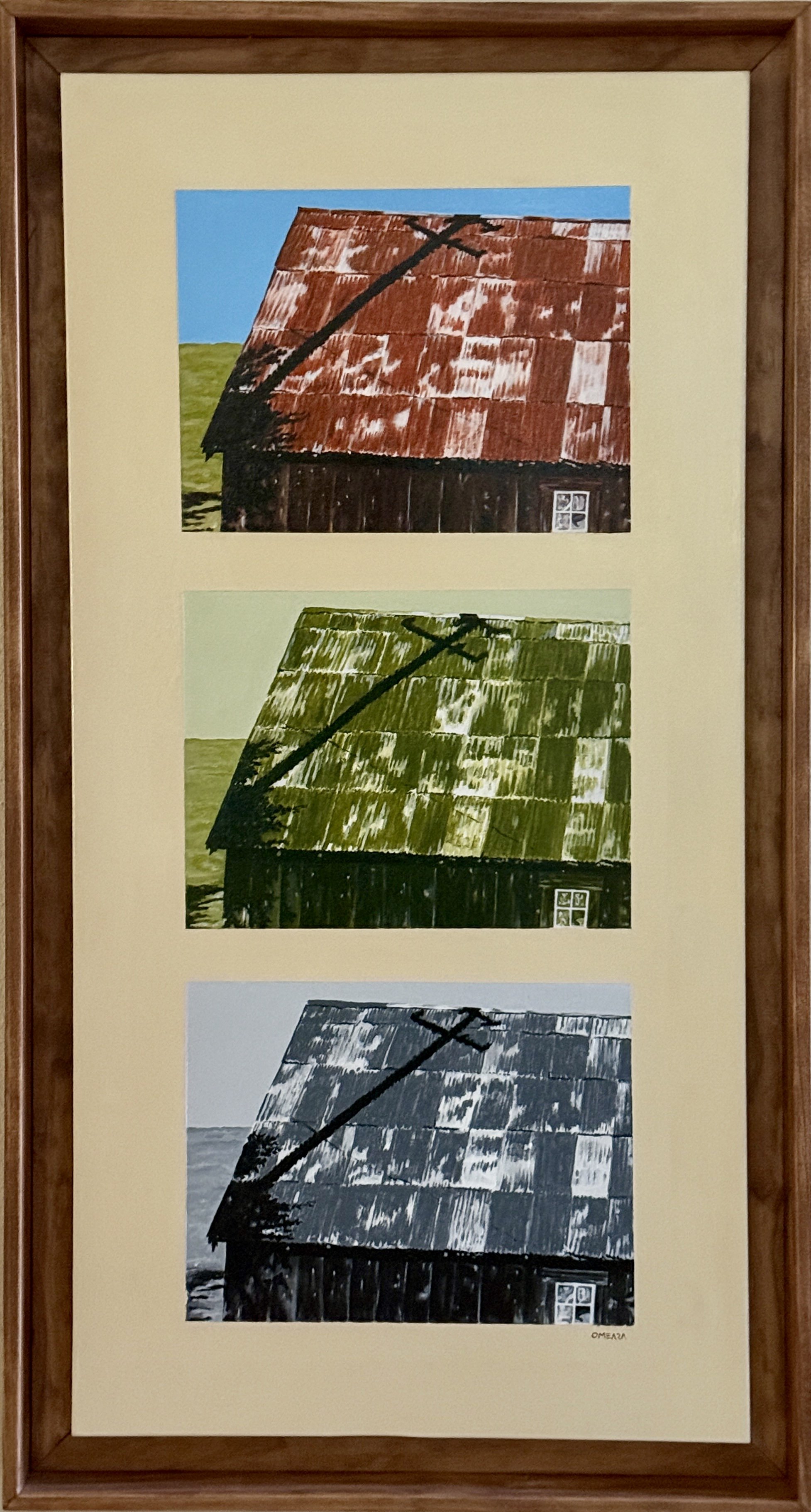 3 Barns, acrylic on canvas, custom framed 40x21"